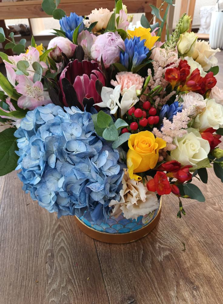 Aranjament la cutie cu hortensie, protea, trandafiri, bujori, lisianthus, alstroemeria, hypericum, astilbe, carnation, gentiana, eucalipt, salal