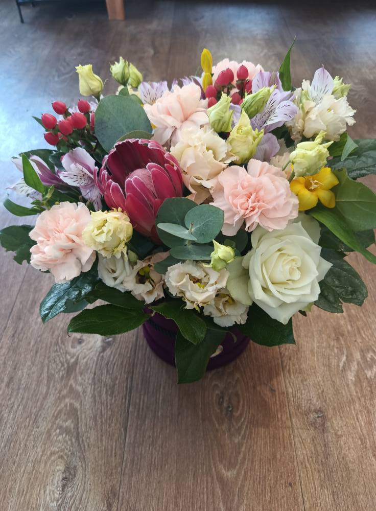 Aranjament la cutie cu protea, trandafiri, carnation, frezii, lisianthus, hypericum, alstroemeria, eucalipt, salal