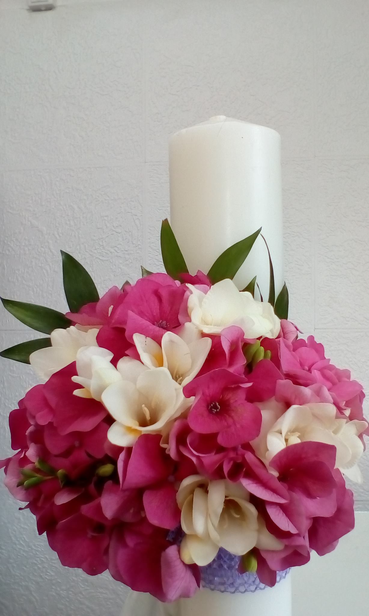 Lumanare botez cu hortensie, frezii, ruscus